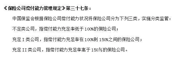 坦白地說,償付能力是當(dāng)所有保單都在尋找保險(xiǎn)公司申請理賠時(shí),保險(xiǎn)公司有能力同時(shí)支付所有保單理賠的要求。監(jiān)管機(jī)構(gòu)將要求保險(xiǎn)公司至少擁有100%以上的資金償付能力。在中國,保險(xiǎn)公司的償付能力進(jìn)行了嚴(yán)格監(jiān)管三類。